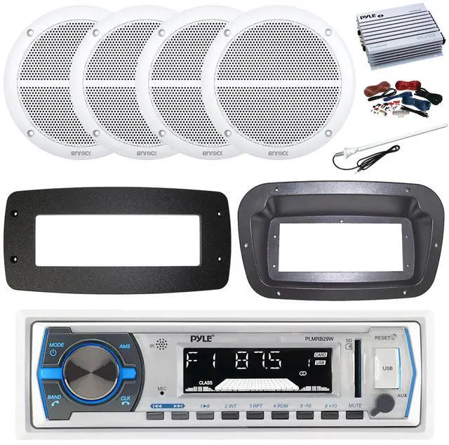PACKAGE BUNDLE INCLUDES: Pyle PLMRB29W Single DIN Bluetooth Marine MP3 Stereo Receiver, Spa bezel, Adapter Plate, 22" Radio Antenna, Wire, 4x 6.5" 180 Watt Peak 2-Way Blue Flashing LED Boat Audio Speakers (White) Spa Bezel DOES NOT INCLUDE INSTALL SCREWS