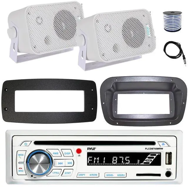 PACKAGE BUNDLE INCLUDES: Pyle PLCDBT65 Single DIN Bluetooth Marine CD Stereo Receiver, Spa bezel, Adapter Plate, 22" Radio Antenna, Wire, 2x 5.25" 400W Max Indoor/Outdoor Waterproof Audio Speakers (White) Spa Bezel DOES NOT INCLUDE INSTALL SCREWS