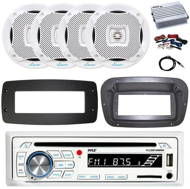 PACKAGE BUNDLE INCLUDES: Pyle PLCDBT65 Single DIN Bluetooth Marine CD Stereo Receiver, Spa bezel, Adapter Plate, 22" Radio Antenna, Wire, 4x 6.5" 450 Watt Peak 2-Way Water Resistant Boat Audio Speakers (White) Spa Bezel DOES NOT INCLUDE INSTALL SCREWS