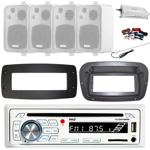 Pyle PLCDBT65 Single DIN Bluetooth Marine CD Stereo Receiver, Spa bezel, Adapter Plate, 22" Radio Antenna, Wire, 4x 6.5" 180 Watt Max Power 2-Way Water Resistant Audio Speakers (Charcoal)
