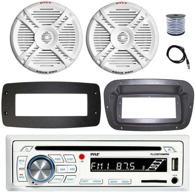 Pyle PLCDBT65 Single DIN Bluetooth Marine CD Stereo Receiver, Spa bezel, Adapter Plate, 22" Radio Antenna, Wire, 2x 5.25" 20 Watt Max Polycone Audio Speakers (White, Bulk Packaging)