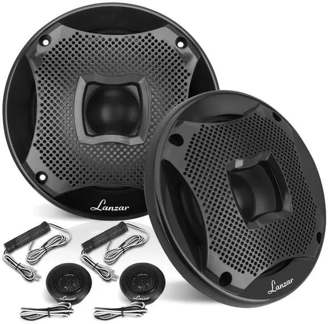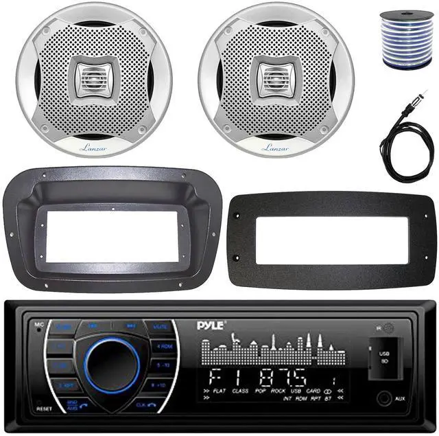 • PACKAGE BUNDLE INCLUDES: Pyle PLRMR27BTB Single-DIN Marine Bluetooth USB/AUX MP3 AM/FM Radio Stereo Receiver W/Single-DIN Install Kit + Adapter Plate, 2x Lanzar AQ5CXS 5.25" 400 Watts Max Power 2-Way Water-Resistant Silver Boat Speakers, 50 Feet 18 Gauge Speaker Wire, 22" Radio Antenna