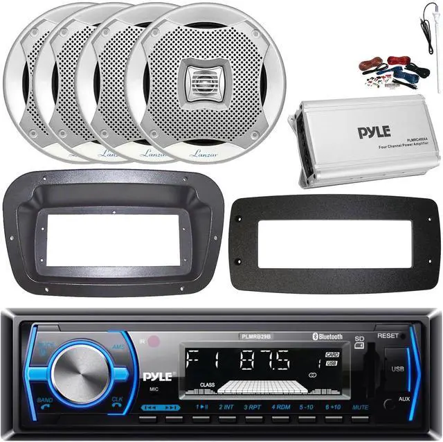 PACKAGE BUNDLE INCLUDES: Pyle PLMRB29B Single-DIN Marine Bluetooth USB/AUX MP3 AM/FM In-Dash Stereo Black Receiver W/Single-DIN Install Kit + Adapter Plate, 4x Lanzar AQ6CXS 6.5" 400W Max Power 2-Way Water-Resistant Boat Audio Silver Speakers, Pyle PLMRC400X4 4-Channel Class D Compact Amplifier W/8-Gauge Amplifier Wiring Installation Kit, Long Range Radio Antenna Spa Bezel DOES NOT INCLUDE INSTALL SCREWS