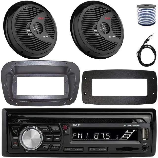 PACKAGE BUNDLE INCLUDES: Pyle PLCDBT95 Single-DIN Bluetooth Marine AUX/USB CD Player/MP3 AM/FM In-Dash Stereo Receiver W/Single-DIN Install Kit + Adapter Plate, 2x Pyle PLMR80B 8'' 180 Watt Max Power Waterproof Full Range Boat Black Speakers, 50 Feet 18 Gauge Speaker Wire, 22" Radio Antenna Spa Bezel DOES NOT INCLUDE INSTALL SCREWS