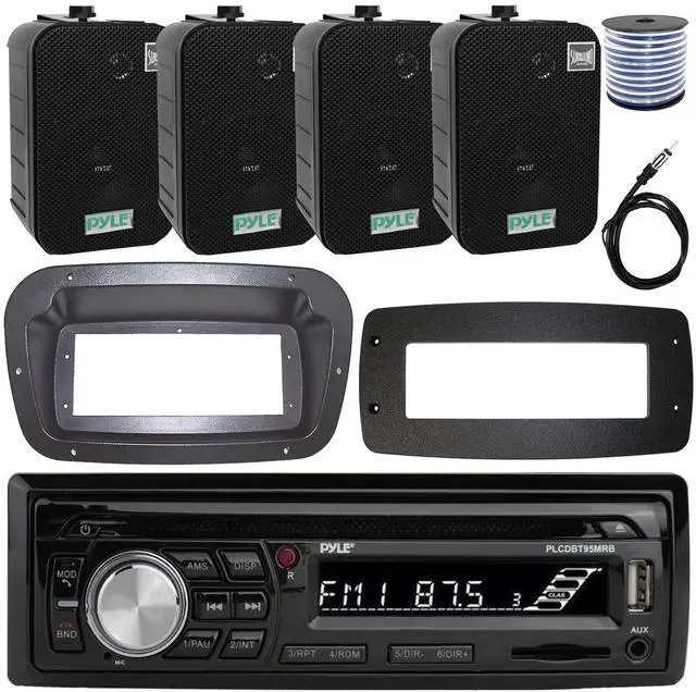 • PACKAGE BUNDLE INCLUDES: Pyle PLCDBT95 Single-DIN Bluetooth Marine AUX/USB CD Player/MP3 AM/FM In-Dash Stereo Receiver W/Single-DIN Install Kit + Adapter Plate, 4x Pyle PDWR40B 5.25" 400W Max Power Home Dual Weatherproof Wall/Ceiling Mounted Black Speakers, 50 Feet 18 Gauge Speaker Wire, 22" Radio Antenna Spa Bezel DOES NOT INCLUDE INSTALL SCREWS