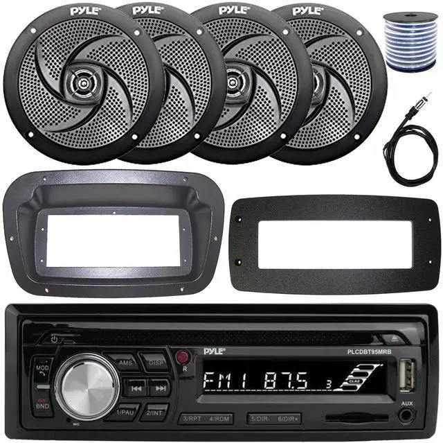 • PACKAGE BUNDLE INCLUDES: Pyle PLCDBT95 Single-DIN Bluetooth Marine AUX/USB CD Player/MP3 AM/FM In-Dash Stereo Receiver W/Single-DIN Install Kit + Adapter Plate, 4x Pyle PLMRS5B 5.25" 180 Watt Max Power 2-Way Waterproof Low Profile Slim Style Boat Audio Black Speakers, 50 Feet 18 Gauge Speaker Wire, 22" Radio Antenna Spa Bezel DOES NOT INCLUDE INSTALL SCREWS