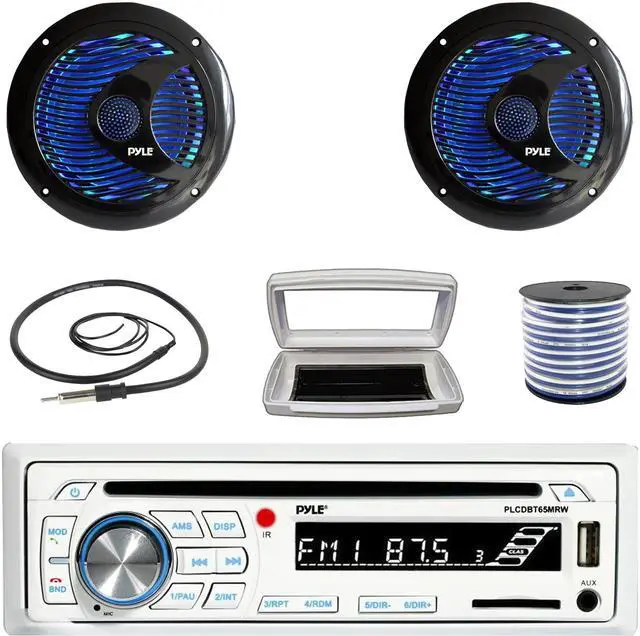 • PACKAGE BUNDLE INCLUDES: Pyle PLCDBT65 Single-DIN Marine Bluetooth USB/AUX CD Player AM/FM Stereo Receiver W/White Marine Stereo Splash Cover, 2x Pyle PLMR6LEB 6.5'' 150 Watt Max Power Dual Cone RGB LED Outdoor Boat Audio Black Speakers, 50 Feet 18 Gauge Speaker Wire, 22" Radio Antenna