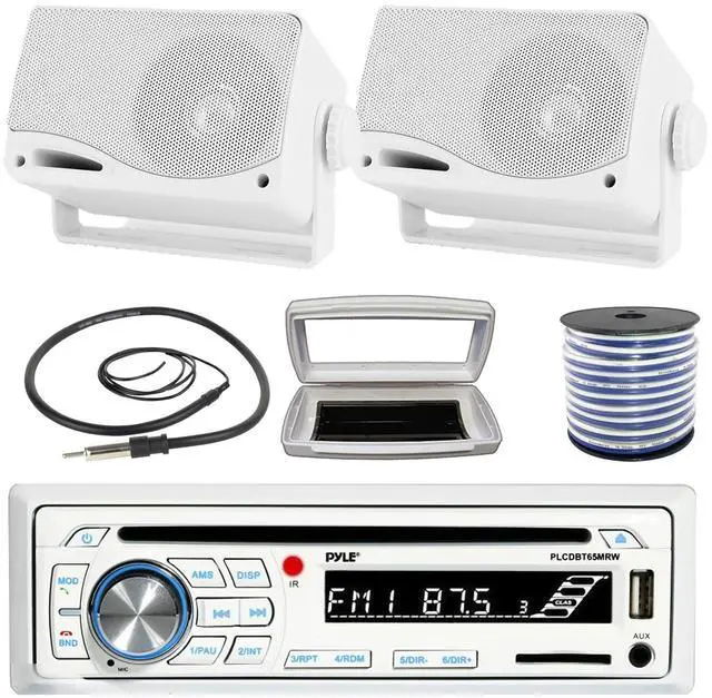 • PACKAGE BUNDLE INCLUDES: Pyle PLCDBT65 Single-DIN Marine Bluetooth USB/AUX CD Player AM/FM Stereo Receiver W/White Marine Stereo Splash Cover, 2x Pyle PLMR24 3.5'' 200 Watt Max Power 3-Way Weather Proof Mini Box White Speakers, 50 Feet 18 Gauge Speaker Wire, 22" Radio Antenna
