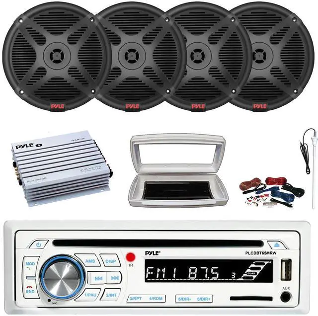 • PACKAGE BUNDLE INCLUDES: Pyle PLCDBT65 Single-DIN Marine Bluetooth USB/AUX CD Player AM/FM Stereo Receiver W/White Marine Stereo Splash Cover, 4x Pyle PLMR652B 6.5" 600 Watt Peak Power 2-Way Coaxial Full-Range Black Boat Speakers, PLMRA400 Marine 4 Channel 400 Watt Amplifier W/8-Gauge Amplifier Wiring Installation Kit, Flexible Long Range Radio Antenna