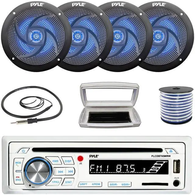 • PACKAGE BUNDLE INCLUDES: Pyle PLCDBT65 Single-DIN Marine Bluetooth USB/AUX CD Player AM/FM Stereo Receiver W/White Marine Stereo Splash Cover, 4x Pyle PLMRS43BL 4" 100 Watt Max Power 2-Way Low Profile Blue Flashing LED Boat Audio Speakers, 50 Feet 18 Gauge Speaker Wire, 22" Radio Antenna