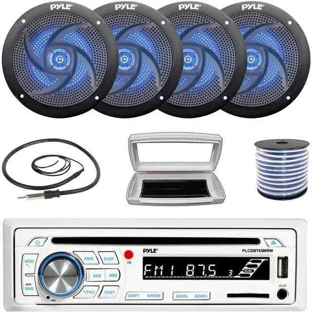 • PACKAGE BUNDLE INCLUDES: Pyle PLCDBT65 Single-DIN Marine Bluetooth USB/AUX CD Player AM/FM Stereo Receiver W/White Marine Stereo Splash Cover, 4x Pyle PLMRS43BL.5 4" 100 Watts Max Power Waterproof Low-Profile Slim Style Blue LED Boat Speakers, 50 Feet 18 Gauge Speaker Wire, 22" Radio Antenna