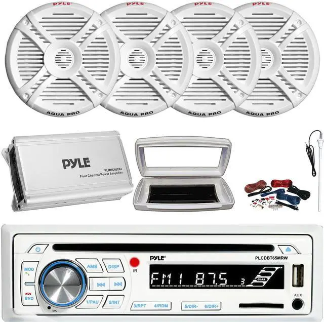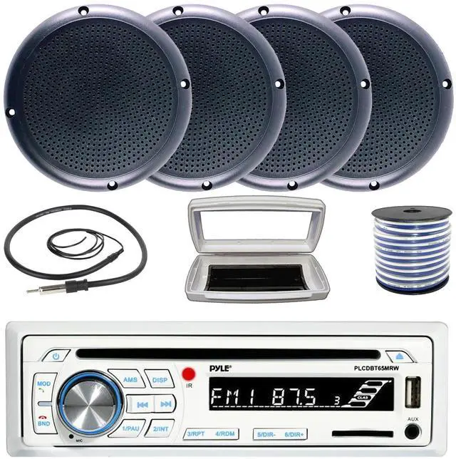 • PACKAGE BUNDLE INCLUDES: Pyle PLCDBT65 Single-DIN Marine Bluetooth USB/AUX CD Player AM/FM Stereo Receiver W/White Marine Stereo Splash Cover, 4x Connexx SPM5B 5.25" 20 Watts RMS Polycone Audio Black Boat Speakers, 50 Feet 18 Gauge Speaker Wire, 22" Radio Antenna