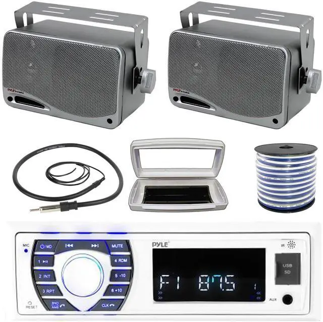 • PACKAGE BUNDLE INCLUDES: Pyle PLRMR23BTW Single-DIN Bluetooth Marine USB/AUX MP3/SD AM/FM Radio Stereo Receiver W/White Marine Stereo Splash Cover, 2x Pyle PLMR24S 3.5'' 200 Watt Max Power 3-Way Weather Proof Mini Box Silver Speaker System, 50 Feet 18 Gauge Speaker Wire, 22" Radio Antenna