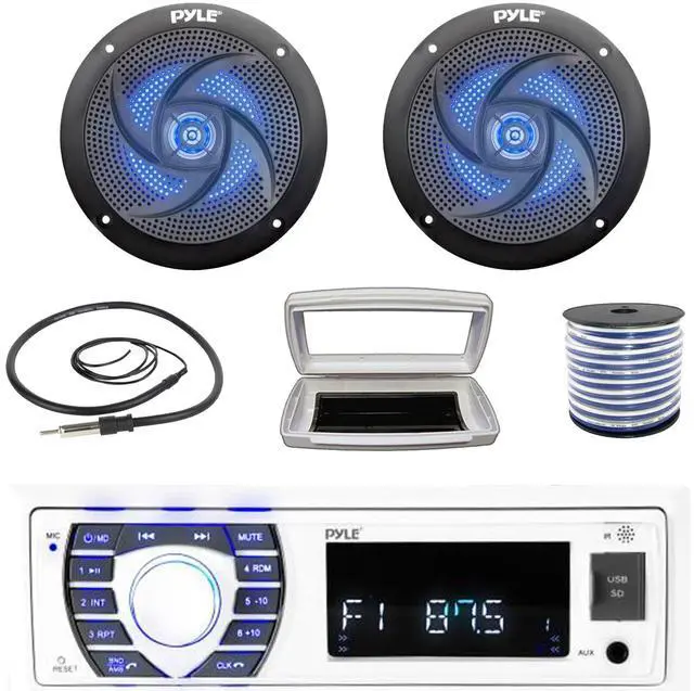• PACKAGE BUNDLE INCLUDES: Pyle PLRMR23BTW Single-DIN Bluetooth Marine USB/AUX MP3/SD AM/FM Radio Stereo Receiver W/White Marine Stereo Splash Cover, 2x Pyle PLMRS43BL 4" 100 Watt Max Power 2-Way Low Profile Blue Flashing LED Boat Audio Speakers, 50 Feet 18 Gauge Speaker Wire, 22" Radio Antenna