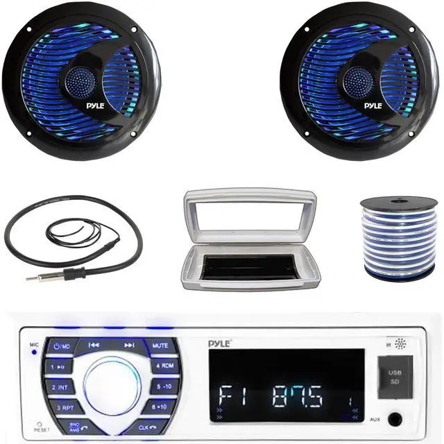 • PACKAGE BUNDLE INCLUDES: Pyle PLRMR23BTW Single-DIN Bluetooth Marine USB/AUX MP3/SD AM/FM Radio Stereo Receiver W/White Marine Stereo Splash Cover, 2x Pyle PLMR6LEB 6.5'' 150 Watt Max Power Dual Cone RGB LED Outdoor Boat Audio Black Speakers, 50 Feet 18 Gauge Speaker Wire, 22" Radio Antenna
