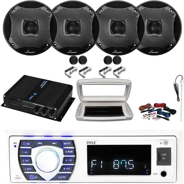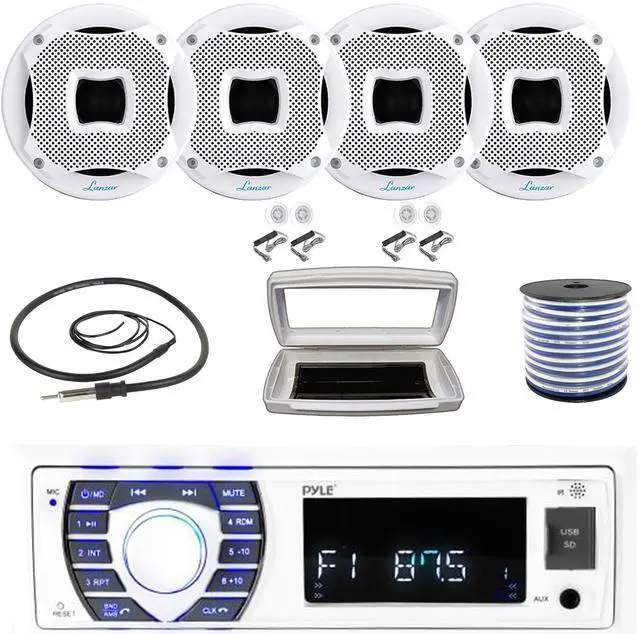 • PACKAGE BUNDLE INCLUDES: Pyle PLRMR23BTW Single-DIN Bluetooth Marine USB/AUX MP3/SD AM/FM Radio Stereo Receiver W/White Marine Stereo Splash Cover, 4x Lanzar AQ65.2CMW 6.5" 450W Max Power 2-Way Boat Audio Component White Speakers, 50 Feet 18 Gauge Speaker Wire, 22" Radio Antenna