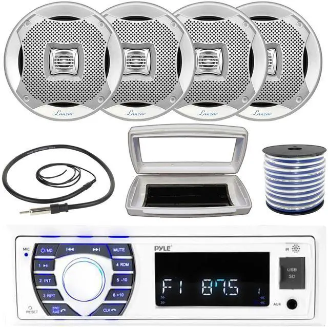 • PACKAGE BUNDLE INCLUDES: Pyle PLRMR23BTW Single-DIN Bluetooth Marine USB/AUX MP3/SD AM/FM Radio Stereo Receiver W/White Marine Stereo Splash Cover, 4x Lanzar AQ5CXS 5.25" Max Power Water Resistant Boat 2-Way Silver Speakers, 50 Feet 18 Gauge Speaker Wire, 22" Radio Antenna