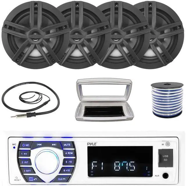 • PACKAGE BUNDLE INCLUDES: Pyle PLRMR23BTW Single-DIN Bluetooth Marine USB/AUX MP3/SD AM/FM Radio Stereo Receiver W/White Marine Stereo Splash Cover, 4x Enrock EM265B 6.5" 180 Watt Max Power 2-Way Boat Audio Speakers, 50 Feet 18 Gauge Speaker Wire, 22" Radio Antenna
