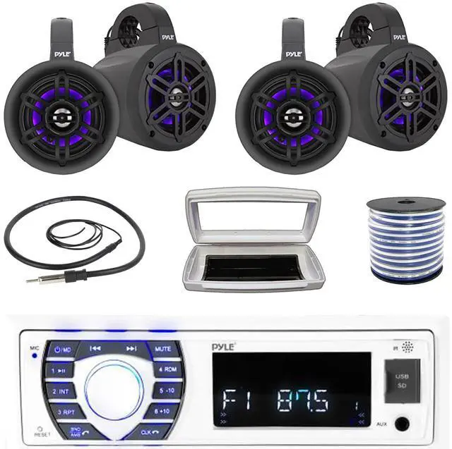 • PACKAGE BUNDLE INCLUDES: Pyle PLRMR23BTW Single-DIN Bluetooth Marine USB/AUX MP3/SD AM/FM Radio Stereo Receiver W/White Marine Stereo Splash Cover, 4x Pyle PLMRLEWB47BB 4" 300 Watt Max Power Waterproof Marine Wakeboard LED Tower Black Speakers, 50 Feet 18 Gauge Speaker Wire, 22" Radio Antenna
