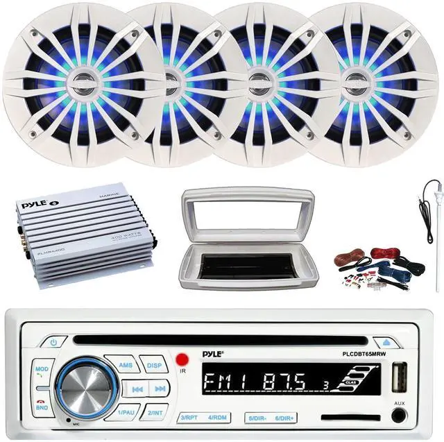 PACKAGE BUNDLE INCLUDES: Pyle PLCDBT65 Single-DIN Marine Bluetooth USB/AUX CD Player AM/FM Stereo Receiver W/White Marine Stereo Splash Cover, 4x Enrock EMLED265W 6.5" 180W Max Power 2-Way Blue LED White Boat Speakers, PLMRA400 Marine 4 Channel 400 Watt Amplifier W/8-Gauge Amplifier Wiring Installation Kit, Flexible Long Range Radio Antenna