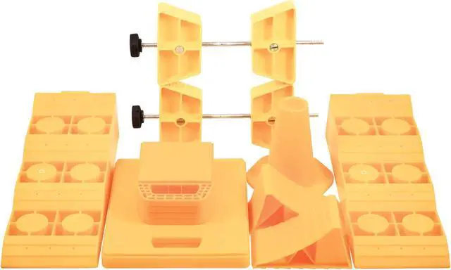 The Camco Big Bag RV Stabilization Kit is a 14-piece kit that includes everything you need to stabilize your RV or trailer. Each stabilization piece is made of durable, UV-stabilized resin and is easy to use. The kit includes (2) tri-levelers for customizable leveling, (2) wheel chocks to help keep your trailer in place, (4) regular and (2) large stabilizing jack pads that help prevent jacks from sinking into the soft ground, (2) wheel stops that lock into tandem tires to prevent movement while parked or re-hitching, (1) tongue jack stands to evenly distribute the weight of the tongue and (1) heavy-duty duffel for convenient storage.