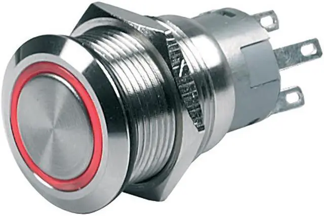 Push-Button Switch 12V Momentary On/Off - Red LEDPush-Button switches and buzzers are built to last with their stainless steel components and silver alloy contacts. The through panel mount switches are ideal for lighting, switch, or dash panels, with colored rings that can be wired to either display power to the system or switch back lighting. The product line includes both switches and warning buzzers.