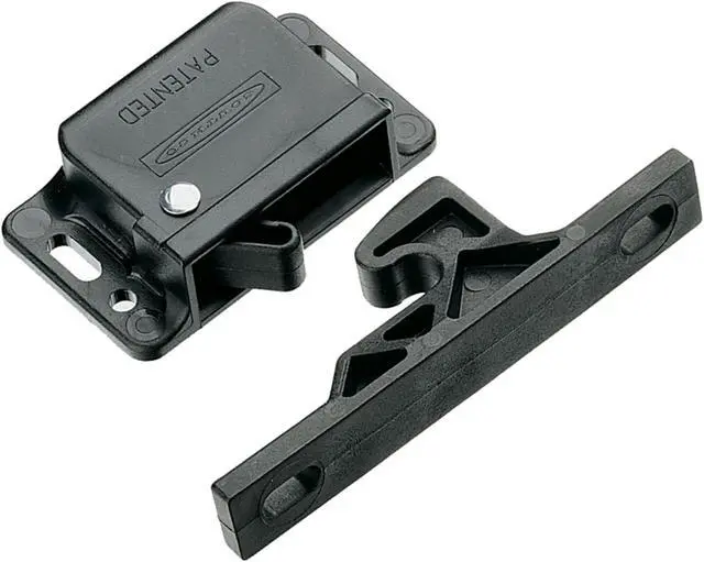Grabber Catch Latch - Side Mount - Black - Pull-Up Force 44N (10lbf) Features: Spring-loaded over-center latching One assembly includes catch and keeper Material and Finish: PC/ABS, black Performance Details: Operating temperature range: -30ºC (-20ºF) to 60ºC (140ºF) Flammability rating: UL94-HB Installation Notes: Orient keeper to latch. The arrow on the keeper should point towards the cam. Mount to door and adjust for smooth latching. Minimum distance from frame (or surfac