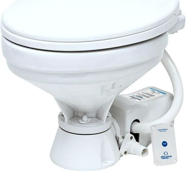 Marine Toilet Standard Electric EVO Comfort - 12V Standard electric comfort toilet with a combined electrical 12V macerator and pump for waste disposal and flushing in one single operation. Including one touch electrical control panel. Easy to clean white regular ceramic bowl and white thermoplastic softclose seat. Stable base for robust installation. Port conections inlet 19mm (3/4″), outlet 25mm or 38mm (1″ or 1,5″). Plug play/interchangeable with Jabsco 37010-1090, Johnson