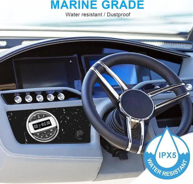 ADDITION FOR FACTORY INSTALLED: The gauge marine media receiver is durable, compact and take up little space on your console. It has user-friendly interface for navigate and 2.5" LCD digital display with easy-to-read in sunny conditions. The marine stereo comes with hardware and labeled wires for ease mounting.