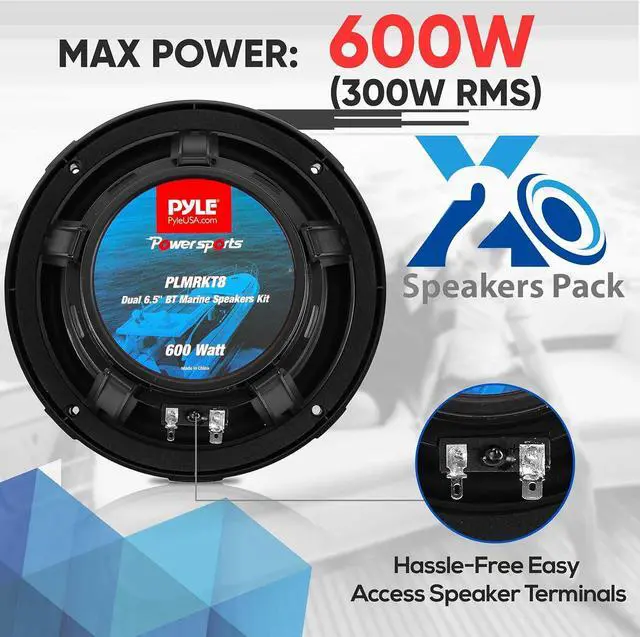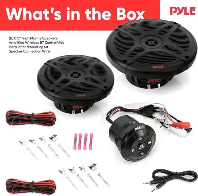The Pyle Dual 6.5 Waterproof-Rated Marine Speaker Kit with Amplified Bluetooth Remote Control Receiver for Car, Truck, Boat, 4x4, PowerSport Vehicles - Waterproof Rated Speakers + Bluetooth Controller System Kit - Universal Mount System for Convenient Audio Control - Bluetooth Wireless Music Streaming Ability - Waterproof-Rated Marine Grade Construction - Weatherproof & Water-Resistant Design - Used for Car, Truck, ATV, UTV, 4x4, Boat, Marine Watercraft, PowerSport Vehicles - Whats in the Box: - (2) 6.5 -inch Marine Speakers - Amplified Bluetooth Control Unit - Installation / Mounting Kit - Speaker Connection Wire - Bluetooth Control Unit: - Built-in Bluetooth Audio Receiver - 2-Channel Amplifier Style - Works with All of Todays Latest Devices - Smartphones, Tablets, Laptops, Computers, etc. - Connect & Stream Audio from Additional External Devices.