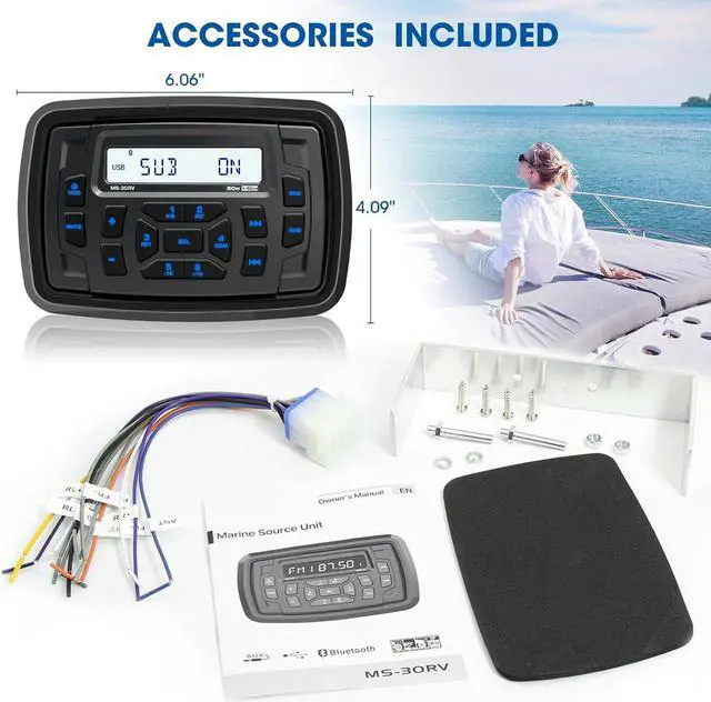 HD LCD DISPLAY & MULTI-COLOR BUTTONS: The water resistant audio for boat is designed with front HD LCD display screen for optimized viewing even during daytime, and RGB 7-multicolor LED buttons to match the relax atmospheer