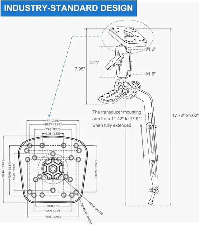 Combination design - Designed for kayak and SUP anglers needing an easy way to install the fishfinder screen and radar at the same time. The 1.5 ball design gives you a much greater clamping force for larger accessories while still having a smooth full range of motion. Has a few options of screw hole patterns to fit various fish finders (Complimentary 4 sets of M5*20 marine grade 316 stainless steel machine screws, sheet metal screws and lock nuts).