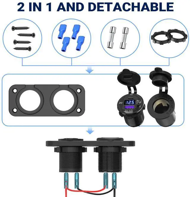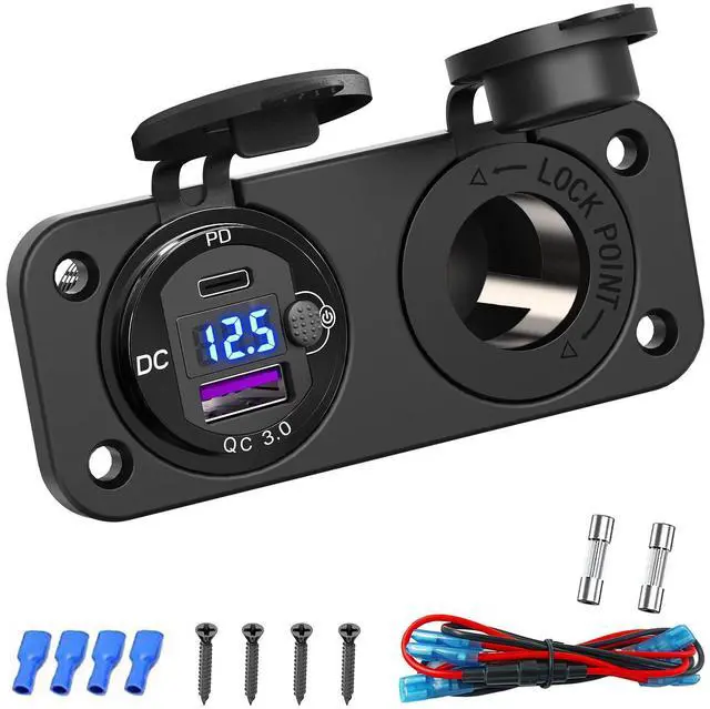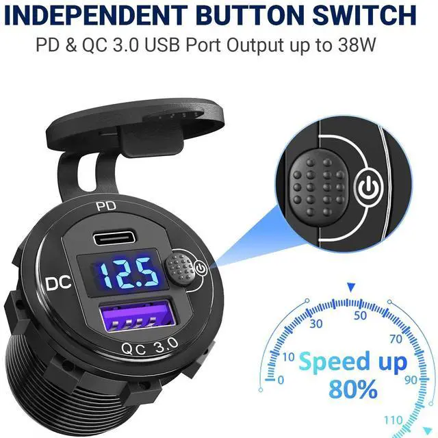 The 12V USB charger is made of aluminum metal, which is sturdier and better texture than traditional plastic models. And the well-designed button switch is more stable on control than touch button, and it controls the digital Voltmeter & 2 USB ports.