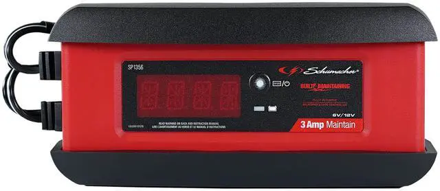 The Schumacher SP1356 Battery Charger and Maintainer is a great option for car, boat, or power sport batteries. Energy efficient and automatic, the unit features easy to connect clamp and ring terminal adapters as well as a convenient hook attachment for hanging the unit outside of the work area. The microprocessor automatically adjusts the amperage rate, with multi-stage charging and float mode monitoring for optimum charging and maintaining to extend battery life. Includes scrolling digital instructions for ease of use and reverse hook-up protection which prevents the charger from operating if the clamps are reversed. Schu Eco Energy meets the highest industry standards. Compatible with standard, AGM, and deep-cycle batteries.