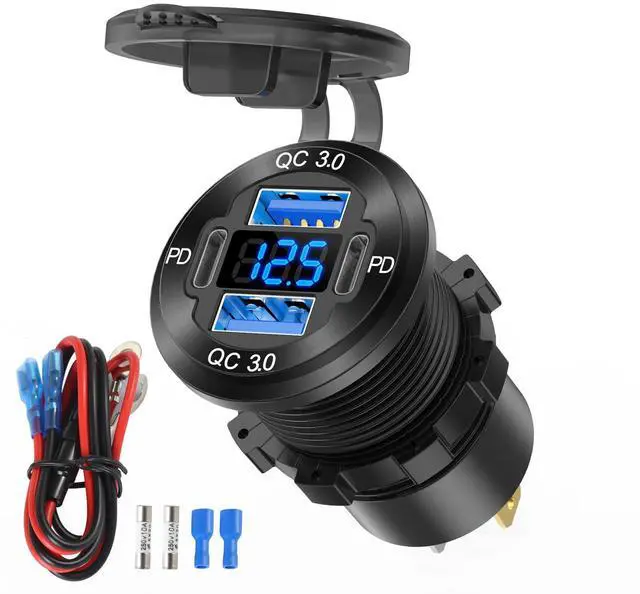 Our 12V USB outlet is easy to install with a 60cm cable (with fuse), 2 spare fuse and 2 blue terminals and takes just 20 minutes to install: plug in “+” for positive and “-” for negative.