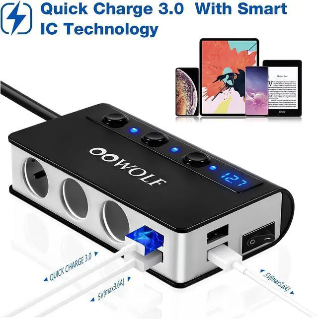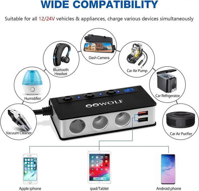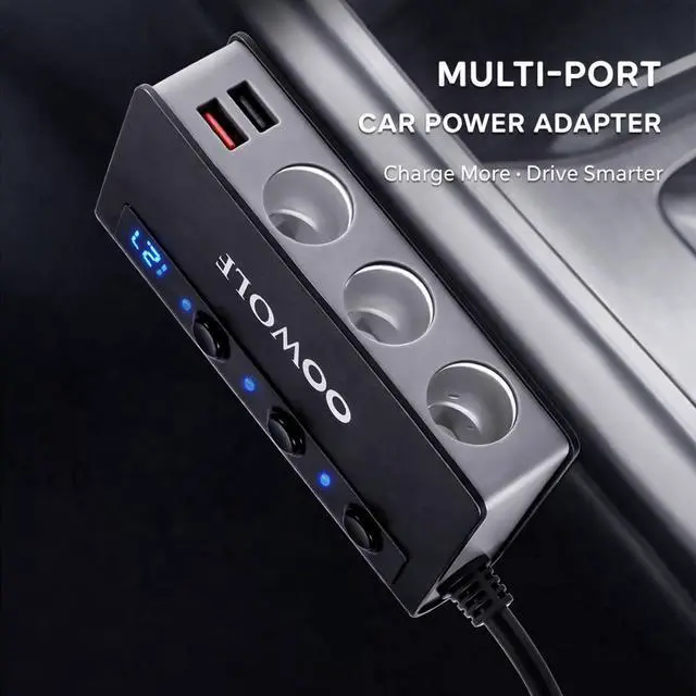 Three cigarette lighter sockets expand your car’s power capacity, powering everything from GPS and dash cams to smartphones, tablets, car vacuums, and portable car refrigerators.