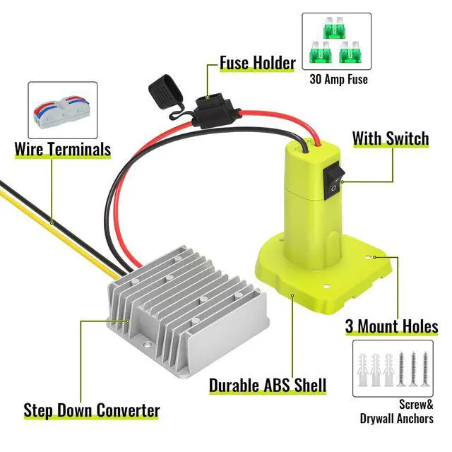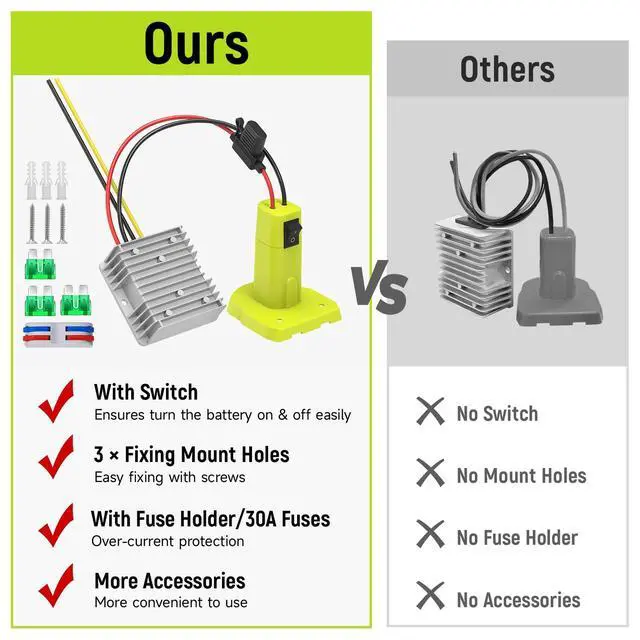Better Safety: Voltage regulator built-in smart chip, features over-current, over-voltage, over-load, short-circuit, over-heat multiple intelligent protection, protect your devices from damage. Power wheel battery adapter also have added switch ensures you can turn on&off the battery easily, along with a fuse holder and a 30A fuse for added safety