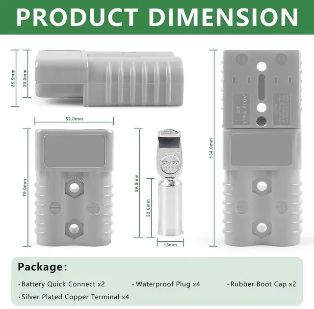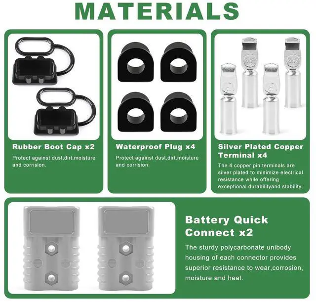 Package Contains: Battery Quick Connect x2, Silver Plated Copper Terminal x4, Waterproof Plug x4, Rubber Boot Cap x2. Widely use in cars, winches, vehicles, forklifts, golf carts, and even mechanical equipments