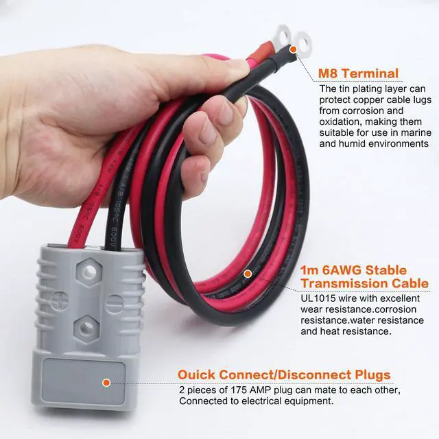 Plug & Play:Pre connected complete set, one end with 175A Anderson plug (same color quick connect), one end with M8 ring terminal, can be installed directly by hand without the need for additional tools
