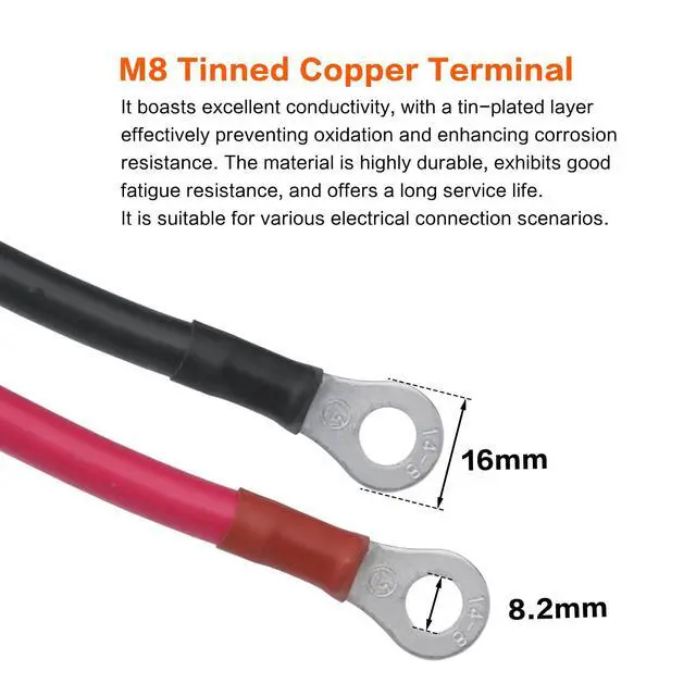 High Conductivity:M8 O-ring terminal (inner diameter 8mm) made of tin plated copper which has strong conductivity and can maintain stable voltage,terminal crimping is firm, with low resistance transmission, and is not easy to loosen after long-term use
