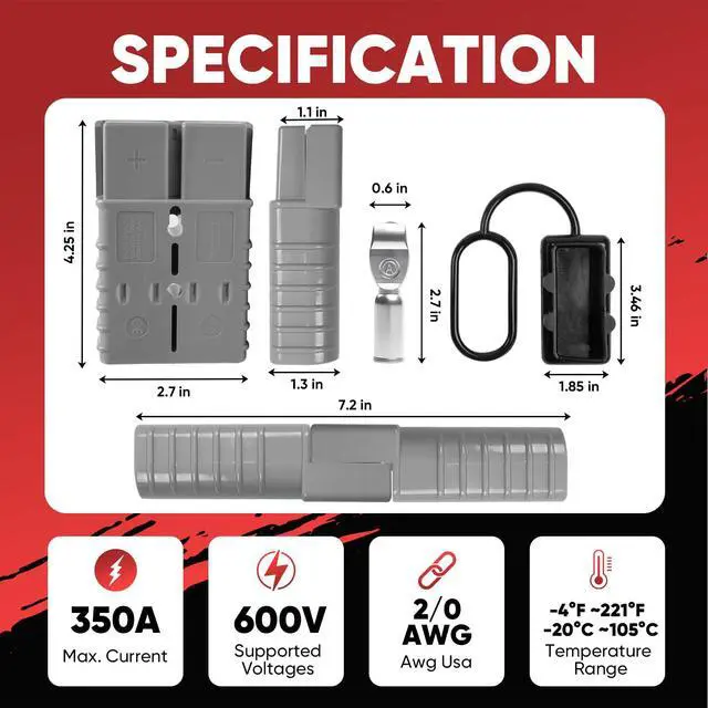 Stable High-Capacity Power Connection Designed for reliable power transfer, this battery quick connect kit supports 2/0 AWG cables, rated for 350A / 600V. Operating temperature range: -20°C to 105°C (-4°F to 221°F). Housing meets UL 94-V0 flammability rating for added protection.