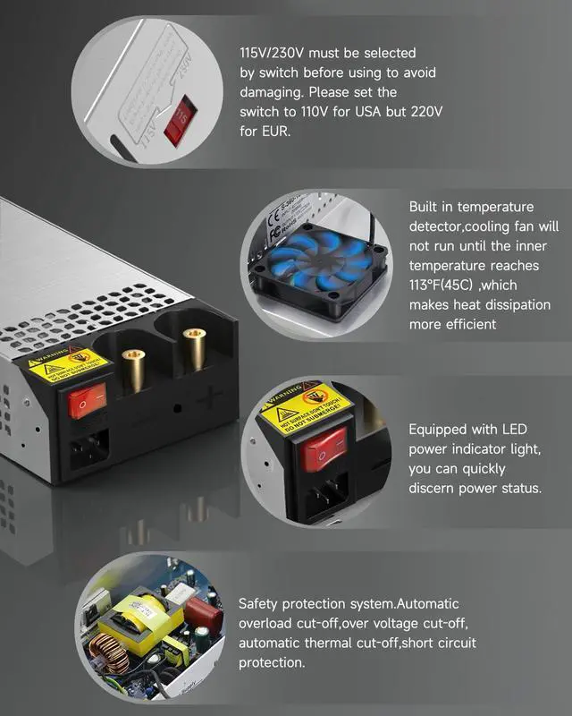 | Warm Tip 1 | We suggest the max use of power should be no more than 80% of the full loads, otherwise,the power supply's spanlife will be shortened. We recommend you to use this 12V 83A 1000W power supply to power devices less than 800W.For resistive device, SMPS peak power = device power × 1.25 times. For Motor device, the peak power of the SMPS needs to be more than 2 times the power of the Motor. |