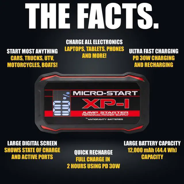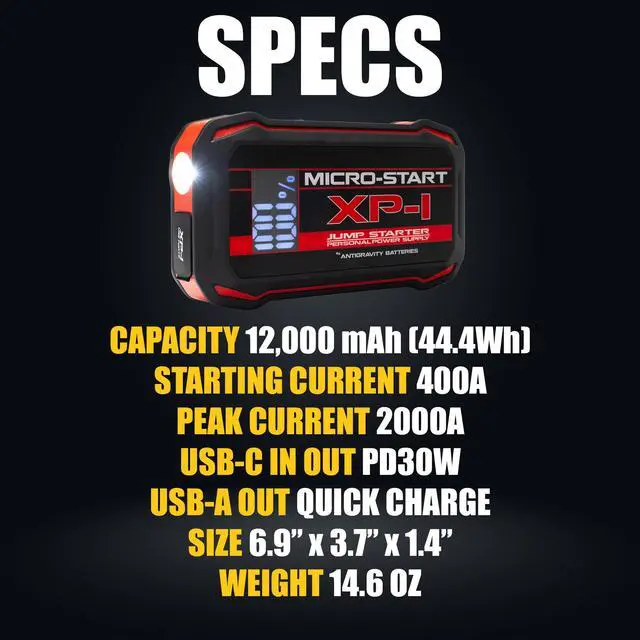 The XP-1-G2 (Gen 2) Micro-Start delivers powerful jump-starting capability and high-speed charging in a compact, lightweight design. Built for reliability and safety, this portable lithium jump starter can start gas engines up to 6.0L V8 while also functioning as a premium portable power bank for modern electronics.