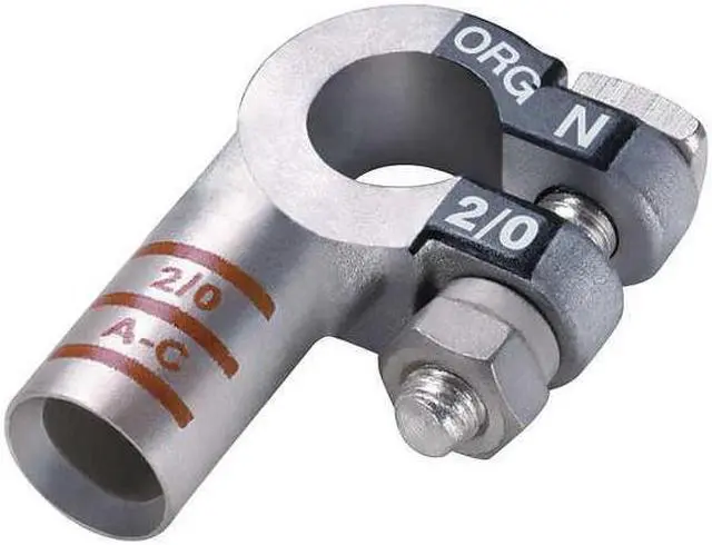 Battery Terminal, Alignment Right Elbow, Connection Type Crimp, Gauge 2/0 ga, Color Code Orange, Polarity Negative, Contact Material Copper, Tin, Overall Length 1 13/16 in, Overall Width 1.4 in, Overall Depth 0.6 in, Features Highest Conductivity Rating, Lead Free Copper, Tin Plated for Corrosion Resistance, Standards RoHS Compliant, SAE J-1811, Includes Bolt, Nut, Maximum Voltage 600V, Stud Size 3/8 in, Package Quantity 5. This item has been restricted from sale in the following state (s): []
