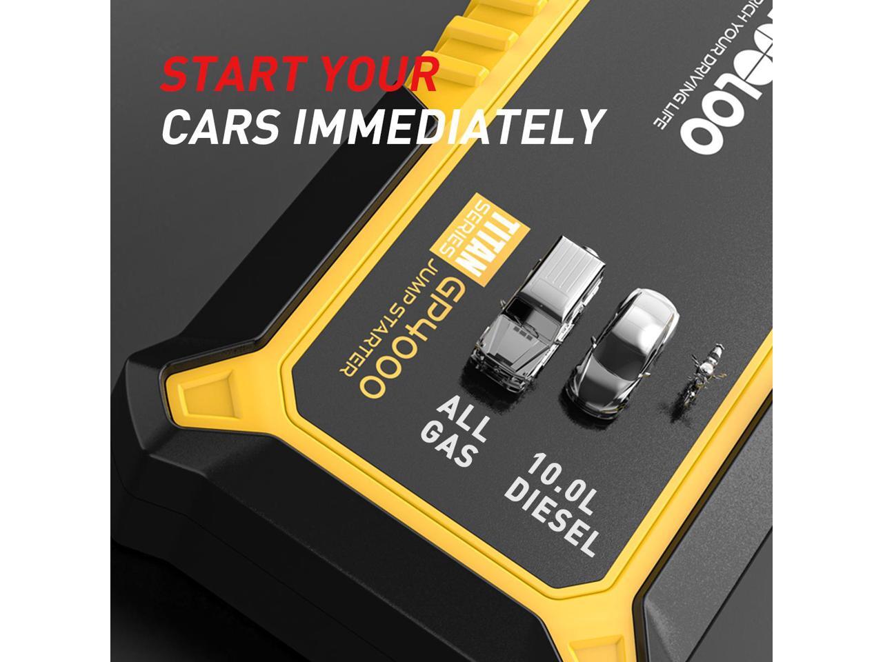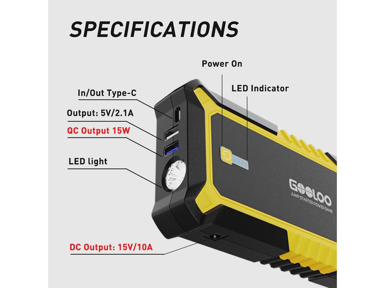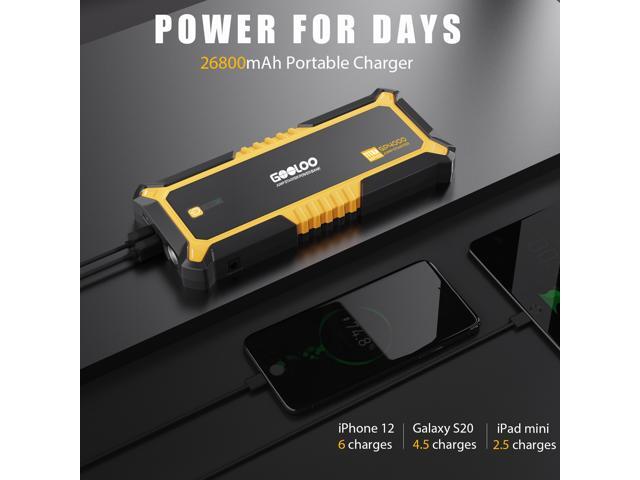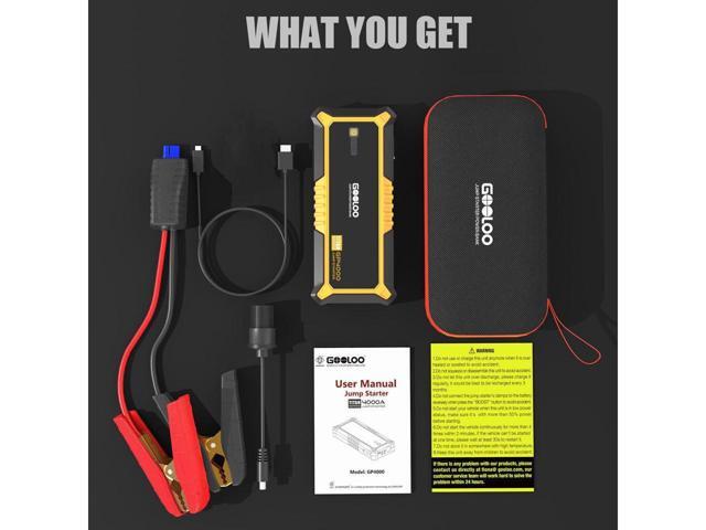 - HIGH CAPACITY PORTABLE CHARGER: GOOLOO Car Starter GP4000 is equipped with dual USB charge ports (one is quick charge). It can be taken anywhere and quickly charge numerous portable devices, such as smartphones, tablets, cameras, GPS, camcorders, Bluetooth headphones and more.