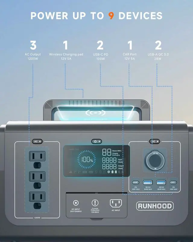 Featuring 3X1200W pure sine wave AC output, 5 DC outlets (2USB-A 28W, 2USB-C 100W, 1Car outlet), and 115W wireless charging, the Runhood Rallye 1200 Max can simultaneously charge up to 9 devices while accommodating various plug requirements.