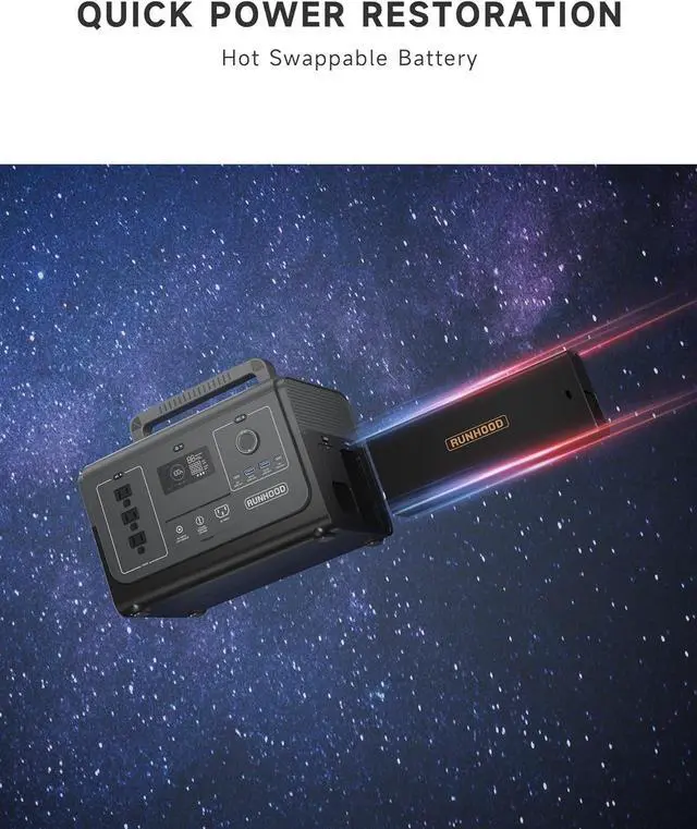 1296Wh capacity. With - 4 hot-swappable batteries for instant full power, we bring back the convenience of old-school removable batteries - just swap for QUICK RESTORATION, like changing batteries in retro cellphones.