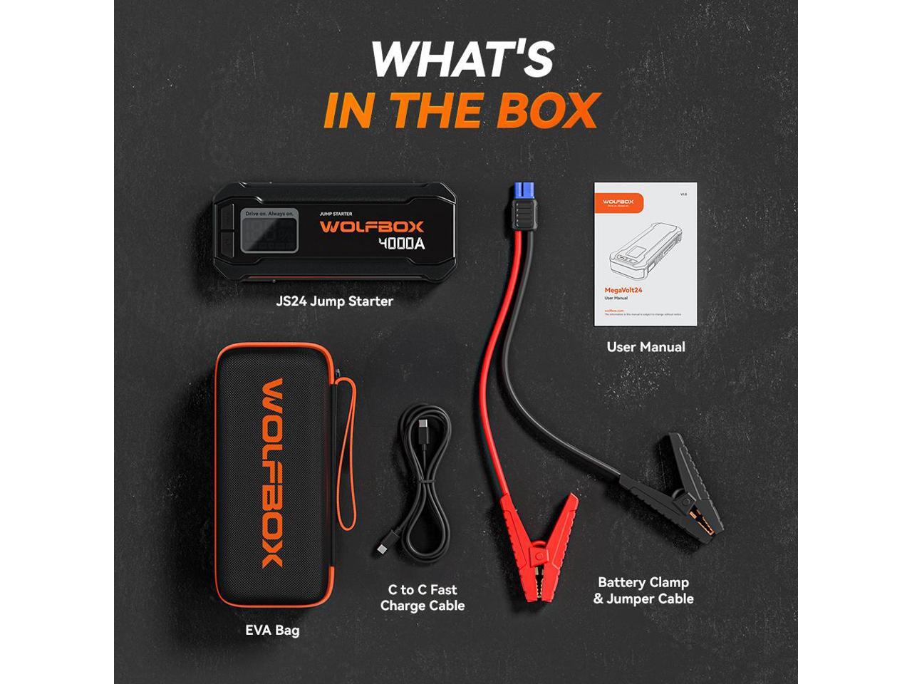 WOLFBOX JS24 4000A Black Jump Starter,12V Car Battery Jump Starter Without PD65W fast charger, 24000mAh Portable Jump Starter Battery Pack(10L Gas 10L Diesel Engine) with Booster,LED Light