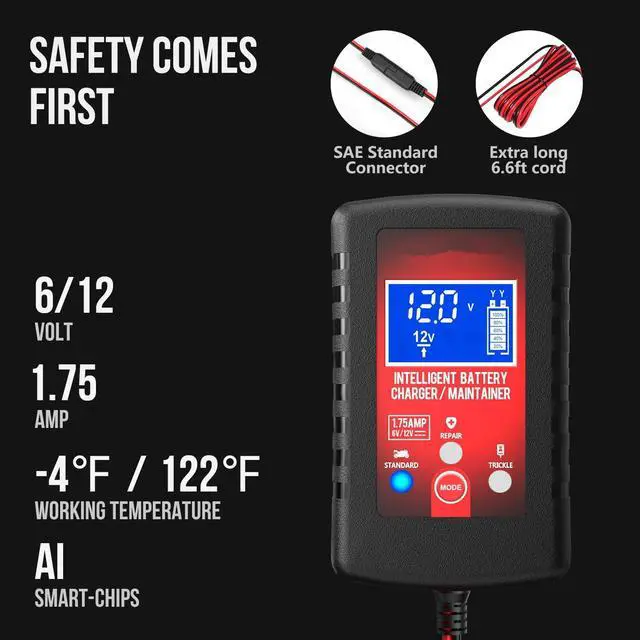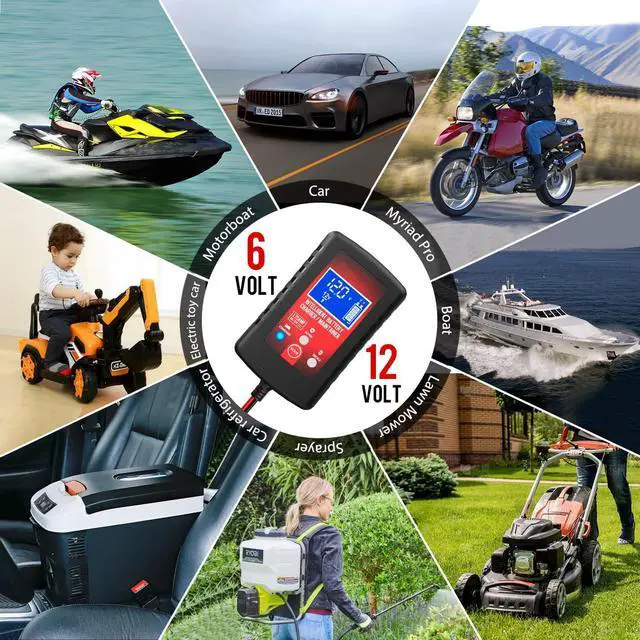 Battery Charger, Maintenance Device and Desulfurizer A compact portable 4-in-1 battery charger, battery maintenance device, trickle charger and battery desulfurizer. It is highly suitable for all types of 6V and 12V lead-acid vehicles, recreational vehicles, power sports and deep cycle batteries, including water-filled batteries, gel batteries, AGM, SLA, VRLA batteries and maintenance-free batteries, and is applicable to cars, golf carts, motorcycles, ships, lawn mowers, marines, all-terrain vehicles, UTVs, etc.