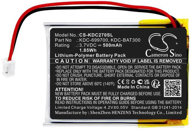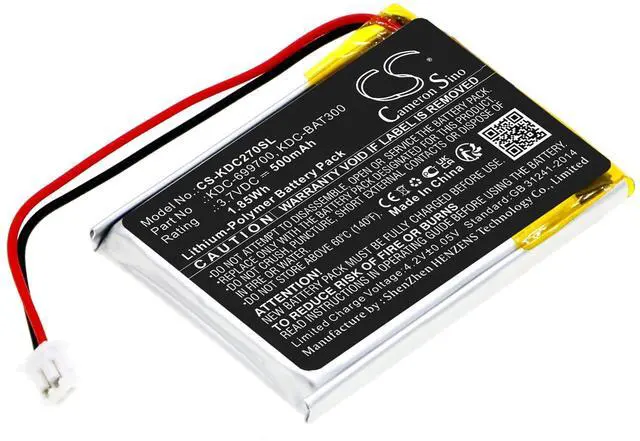 The Cameron Sino replacement battery is specifically designed for use with KDC270, KDC280, KDC30, and KDC300 devices, ensuring compatibility and reliable performance. With a capacity of 500mAh (1.85Wh), this battery offers dependable power, supporting extended device operation for demanding tasks. Manufactured to high standards, it serves as an ideal replacement or backup option, helping to minimize device downtime. The battery is engineered to meet or exceed original equipment specifications, delivering consistent energy output and long-lasting durability.